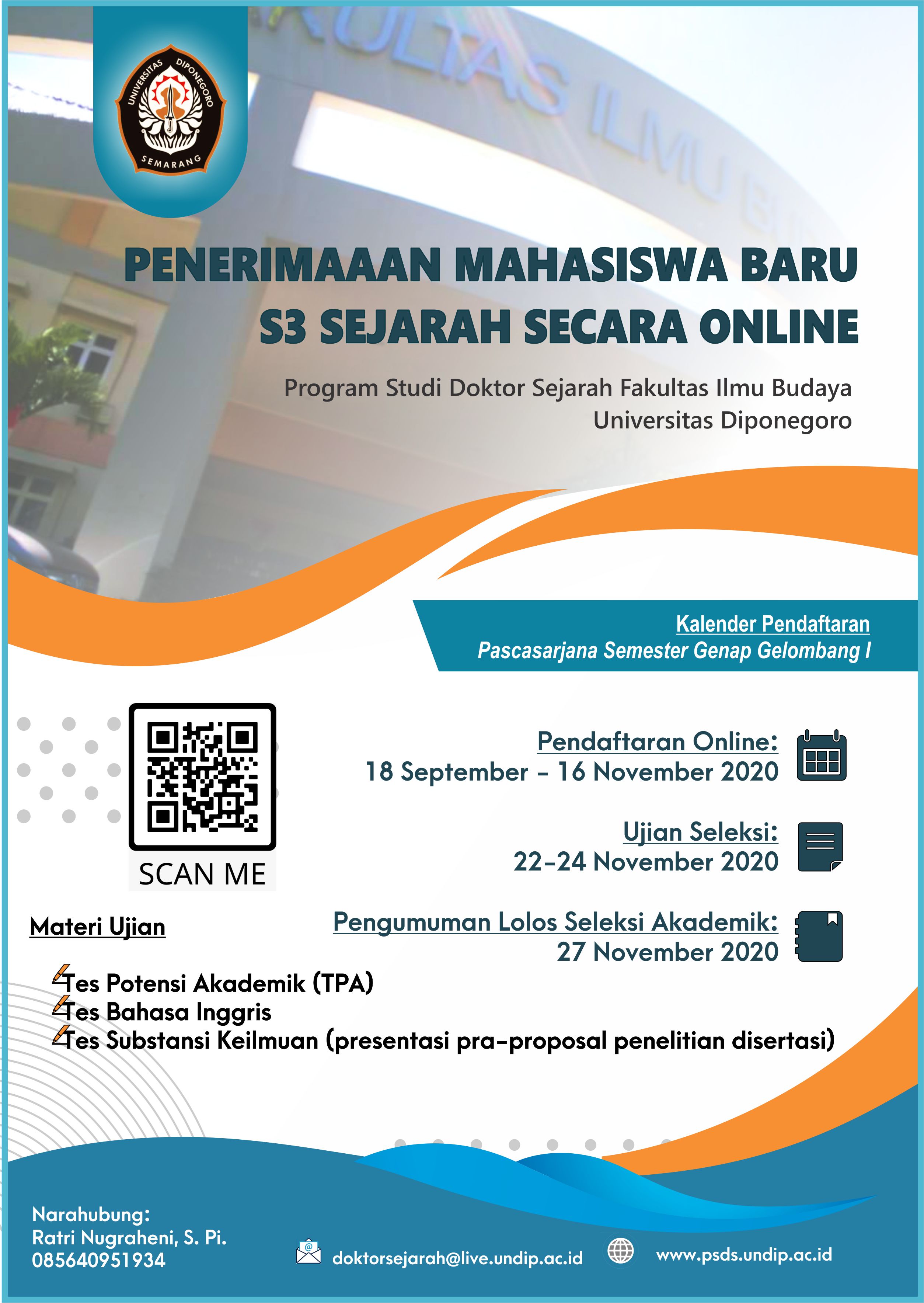 Program Studi Doktor Sejarah (PSDS) Fakultas Ilmu Budaya, Universitas Diponegoro telah membuka pendaftaran untuk mengikuti Program Doktor.